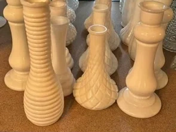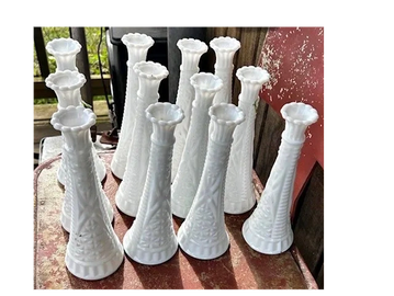 Assorted milk glass bud vases, with unique and different patterns on each.